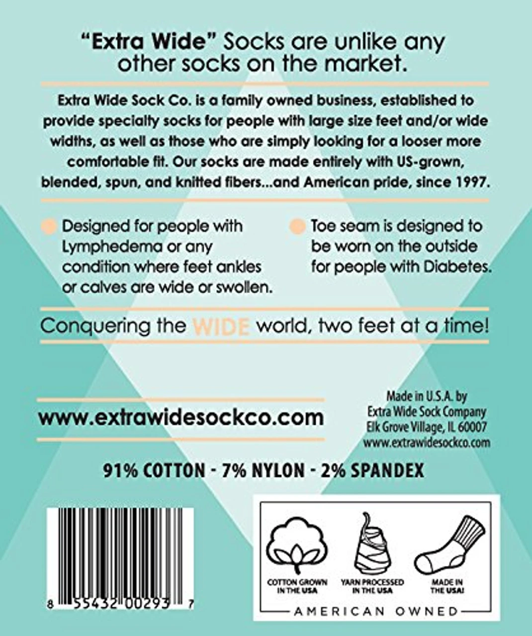Designed for Men and Women with any condition where feet, ankles and calves are wide or swollen. Made in the USA, Beyond Extra Wide Bariatric Socks are like no other sock on the market. Designed to stay up, the calf stretches up to 30” and foot to 21″ and 14E width, making them the widest bariatric socks available. Microban Antimicrobial Technology Helps Prevent the Growth of Odor Causing Bacteria. Inverted Toe Seam is designed to be worn on the outside for people with diabetes. Available in Black or White.