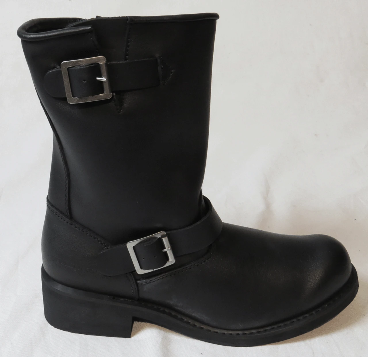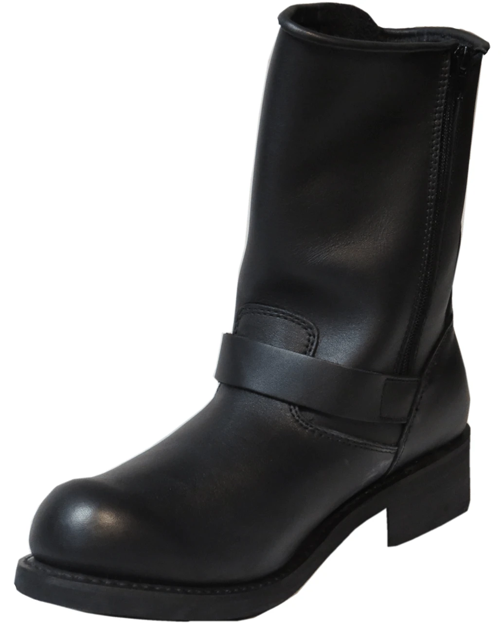 These black leather boots by Boulder Creek feature 2 sets of adjustable buckles with an inside zipper for easy on and off. Genuine leather upper with oil resistant non-slip soles. Top V-shaped panel provides extra space in calf area. Perfect for Motorcycle riding, these boots are not only stylish but also slip-resistant, for maximum safety while on the road. With a mid-heel, they look great paired with your favorite jeans for casual wear.Â