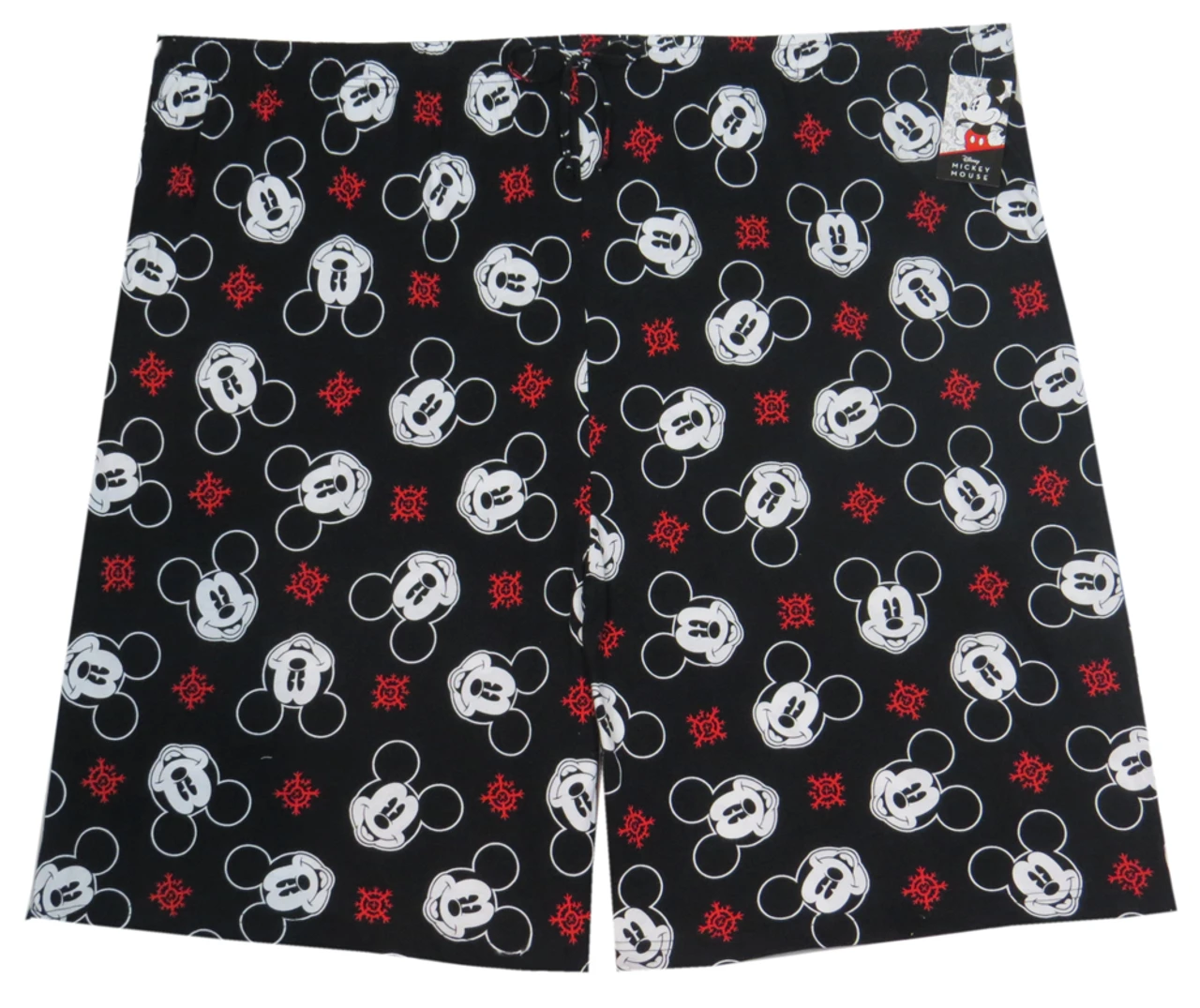 These Officially Licensed Disney Mickey Mouse lounge shorts are perfect for a relaxing night in! They feature a fun black, white and red Mickey Mouse print on extra soft and comfy 100% cotton black shorts. Full Elastic Waist with drawstring, two hip pockets and one back pocket.Â