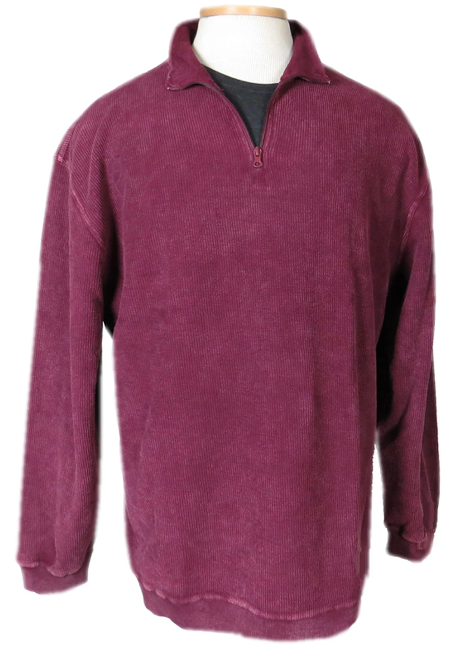This quarter zip pullover by F/X Fusion is a modern-day twist on the classic favorite, corduroy. The textured cord fabric is made with a sandwashed process, giving it a trendy uneven shaded appearance. Comfortable, stylish, and warm, it features ribbed knit cuffs and waistband. Fabric Content: 100% Cotton. Shading, streaking and uneven appearance are natural and inherent in the sandwashed finish.