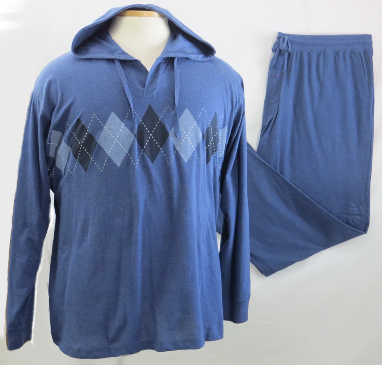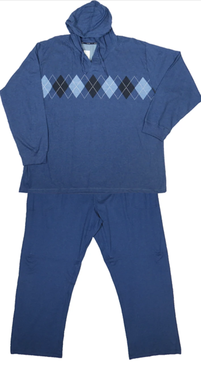Kick back and relax in style in this 2 piece hooded lounge set by Hanes. It features a hooded top with argyle accents, full elastic waist pants with drawstring and two side pockets. Made of extra soft mid-weight 60% Cotton/40% Polyester jersey fabric. Perfect for sleeping or lounging.