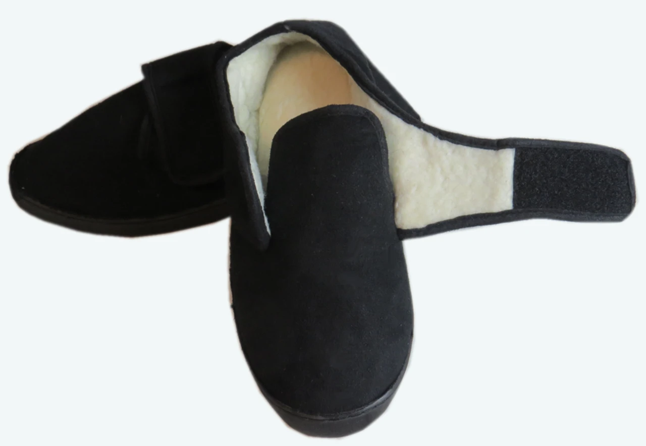 Treat your feet with these cozy adjustable slippers by King Size. They feature an adjustable velcro closure that is perfect for those with wide feet or foot swelling. Polyester fleece upper with sherpa lining and padded footbed for comfort in every step. Non skid outsole, .25″ heel height.
