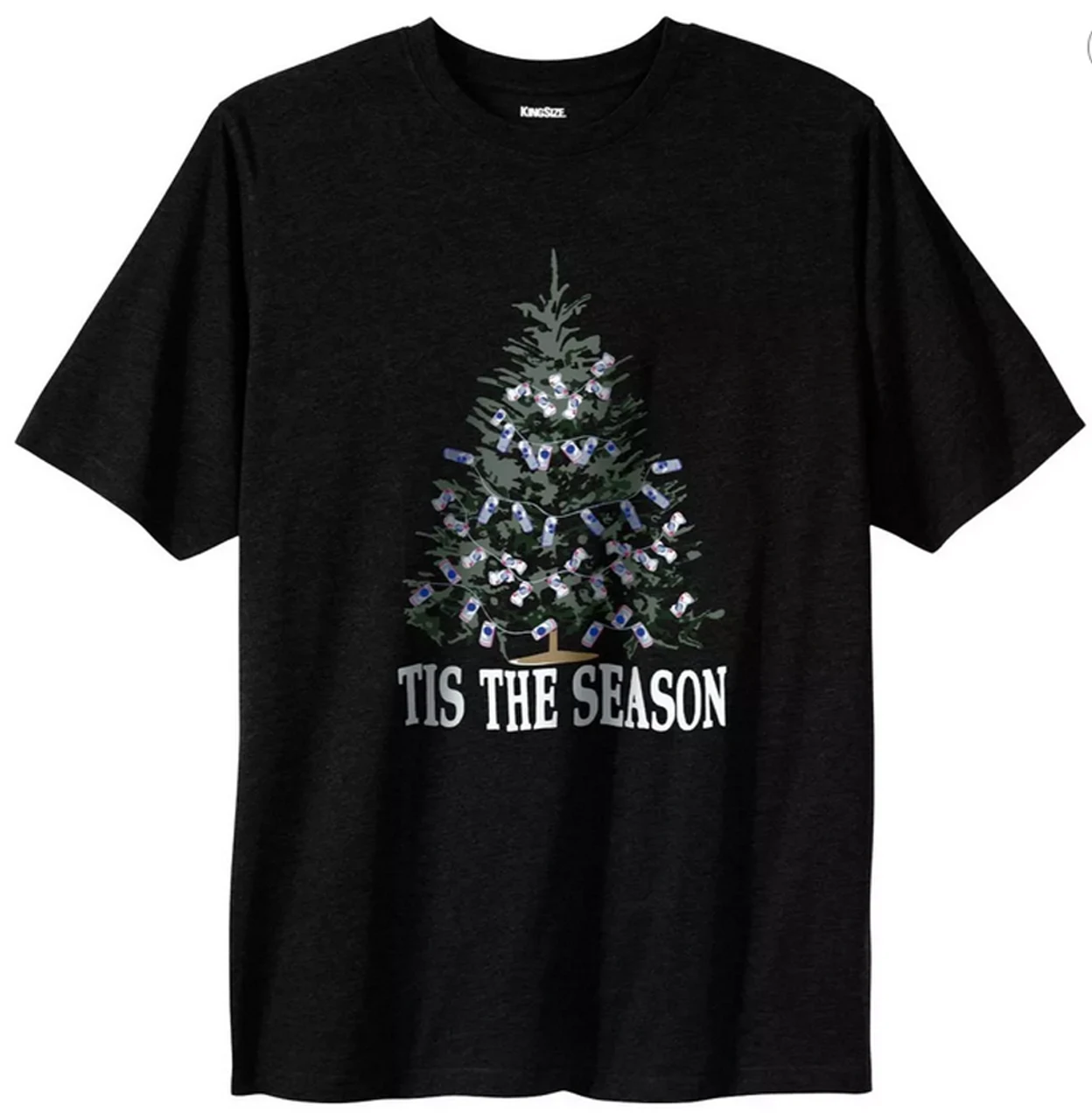 Get in the Holiday Spirit with this festive “Funny Lights” Tee by King Size. It features a Christmas Tree decorated with cheerful recycled can lights, along with the words “Tis the Season” screen printed on the front. This lighthearted short sleeve tee shirt is sure to get a laugh wherever you go this Holiday Season. Screen printed graphics on a high quality 100% Cotton Black Tee Shirt.