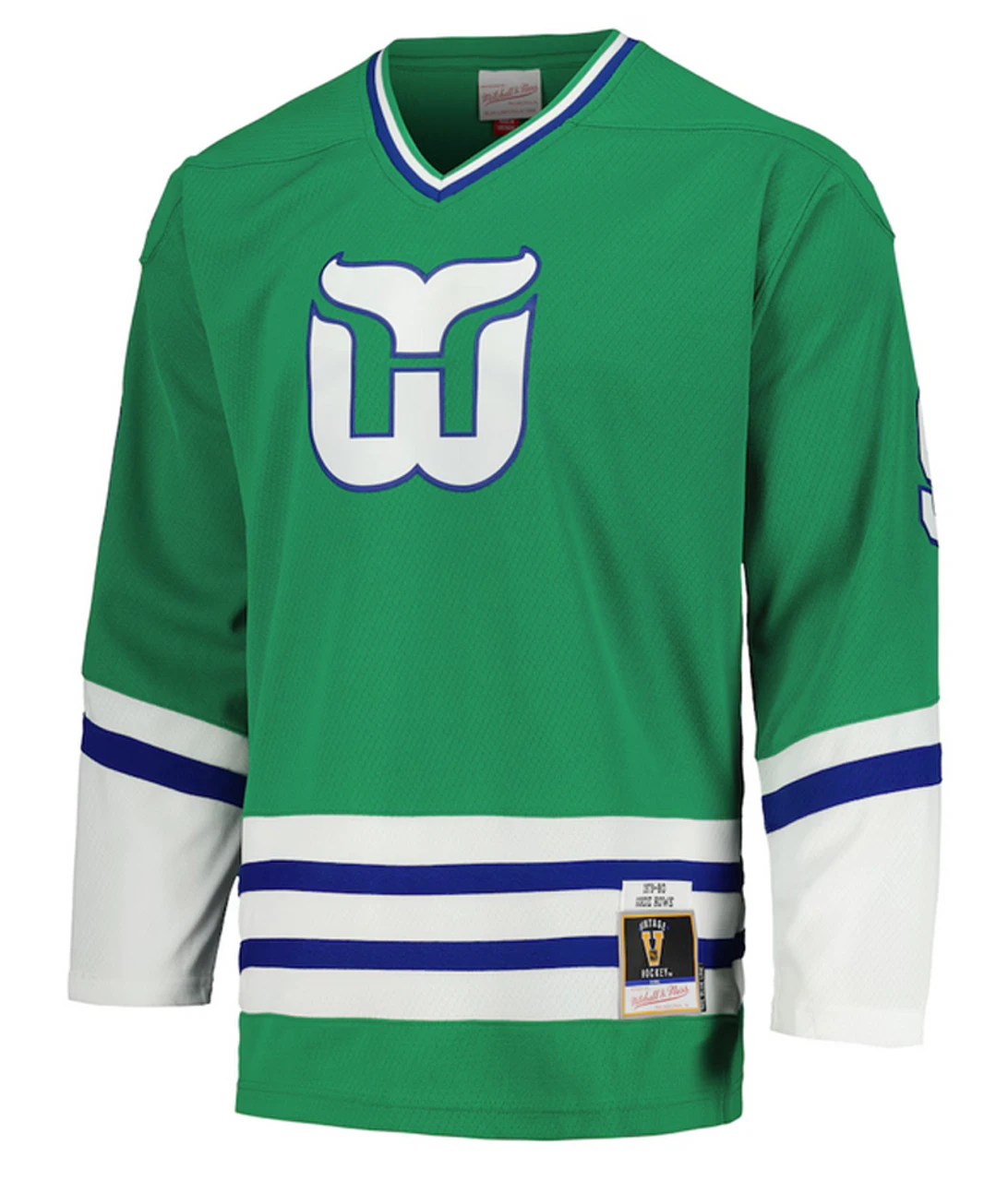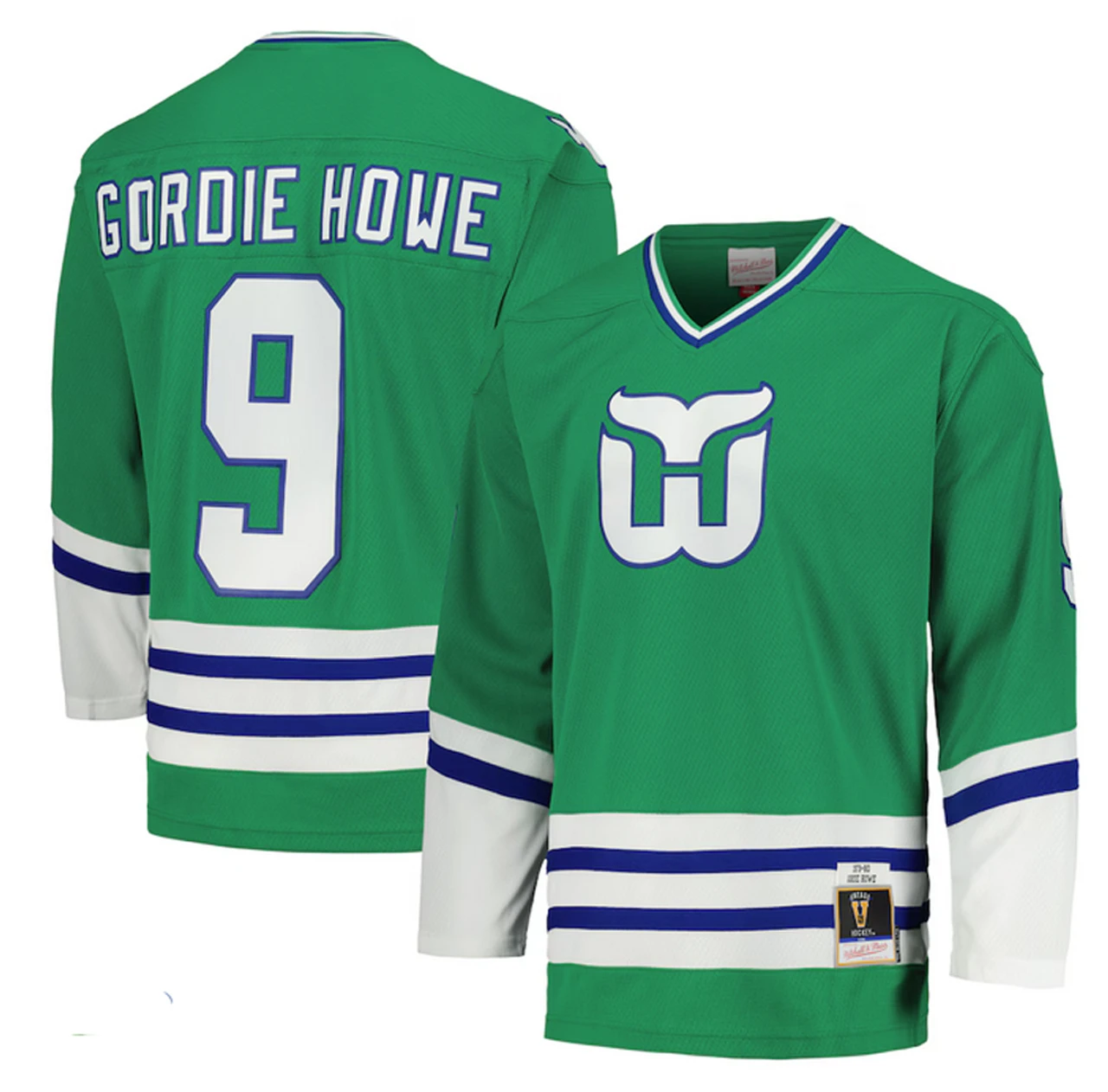 Hockey Fans, you can feel like you’re hitting the ice with the greats with this Gordie Howe Hartford Whalers 1979/80 Blue Line Player Jersey from Mitchell & Ness. This authentic throwback jersey features eye catching green, white and navy Hartford Whalers colors and sewn on appliqued team graphics. Team mascot appliques on each shoulder. V-neck style, side splits at hem and woven jock tag. Officially licensed NHL apparel. Fabric content: 100% Polyester.