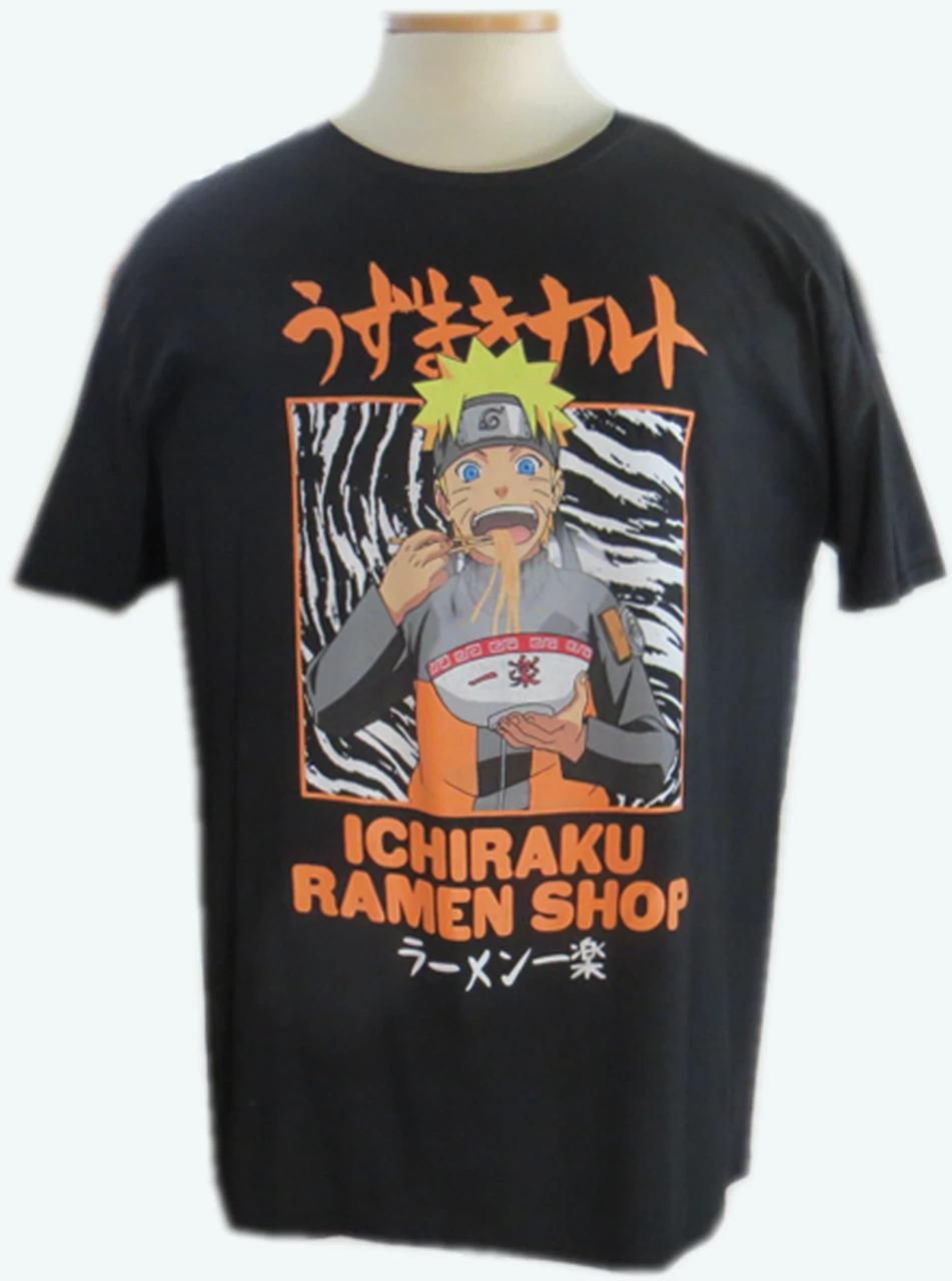 This mid-weight black tee shirt features bright, bold Naruto screen printed graphics on the front. Features ribbed-knit collar and double row stitching at cuffs and hem. Officially licensed Naruto Shippuden Collection merchandise. Fabric content: 100% Cotton.