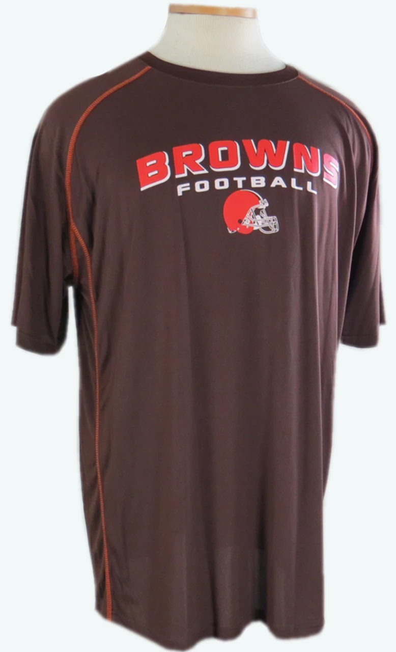 Stay Cool while you represent your favorite team! This Cleveland Browns short sleeve shirt is made of a lightweight, moisture wicking material with a pindot pattern to allow air flow. It features screen printed Browns Football graphics on the front. Contrasting orange stitching at shoulders and sides. Fabric content: 100% Polyester. Officially licensed NFL apparel.