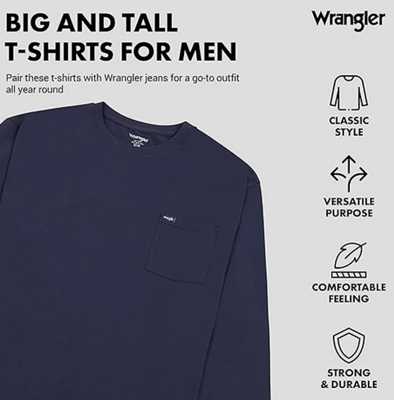 These long sleeve tee shirts by Wrangler are built for everyday wear, weather on the job site or relaxing at home. Made of breathable, heavyweight 100% Cotton that provides warmth in cooler temperatures and breathability in warmer months. These high quality tees feature ribbed knit cuffs and collar with back neck taping for extra durability, left chest pocket with Wrangler logo patch. Relaxed fit for extra comfort. Fabric Content: 100% Cotton.